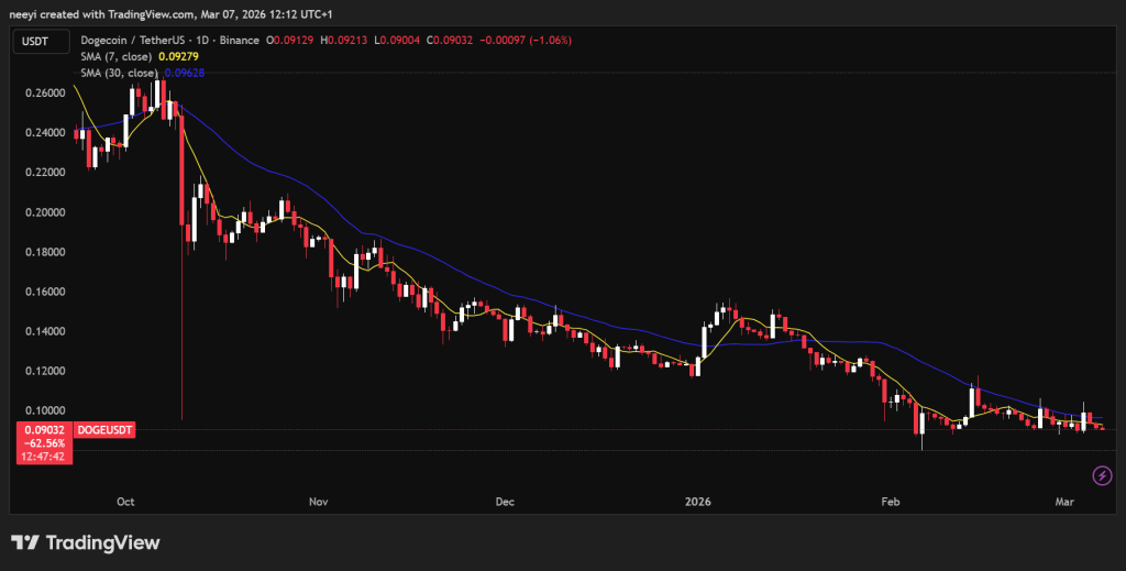 狗狗币价格在过去一周于狭窄区间内交易,目前位于该区间的较低端附近。DOGE在触及周高点约0.097美元和低点接近0.089美元后,目前交易于约0.090美元。