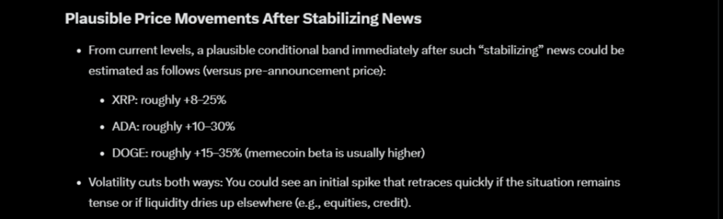 更长期的冲突情景会创造更缓慢的复苏路径。如果地缘政治紧张局势持续到2026年,根据全球宏观条件的不同,XRP的交易区间可能在约0.70美元至2.10美元之间。卡尔达诺可能在约0.11美元至0.40美元之间波动。狗狗币的区间可能在约0.03美元至0.18美元之间。