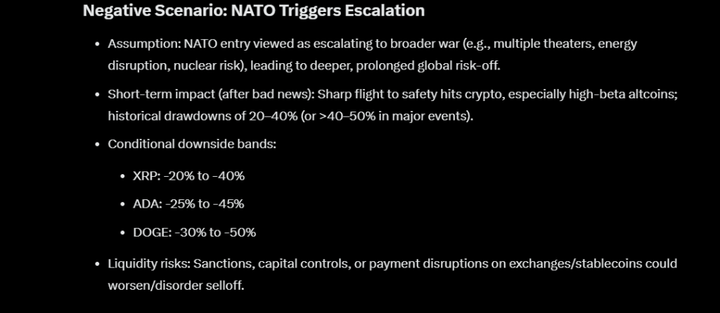 中东不断加剧的地缘政治紧张局势,其影响已开始波及该地区以外的金融市场。美国-以色列联盟与伊朗之间的冲突已引发大宗商品、股票和加密货币市场的普遍不确定性。目前,一个新的辩论焦点已浮现:如果北约介入冲突,将会发生什么?追踪宏观情绪和加密货币波动性的GrokAI模型已开始探索此类情景将如何影响XRP、卡尔达诺和狗狗币等资产。