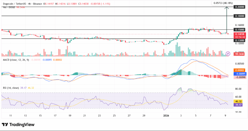 当前相对强弱指数(RSI)处于39的中性线以下位置,MACD柱状图仍为负值。但MACD线正接近信号线,预示动能可能发生转变。若DOGE能维持在0.14美元上方,其上行趋势或将进一步巩固。