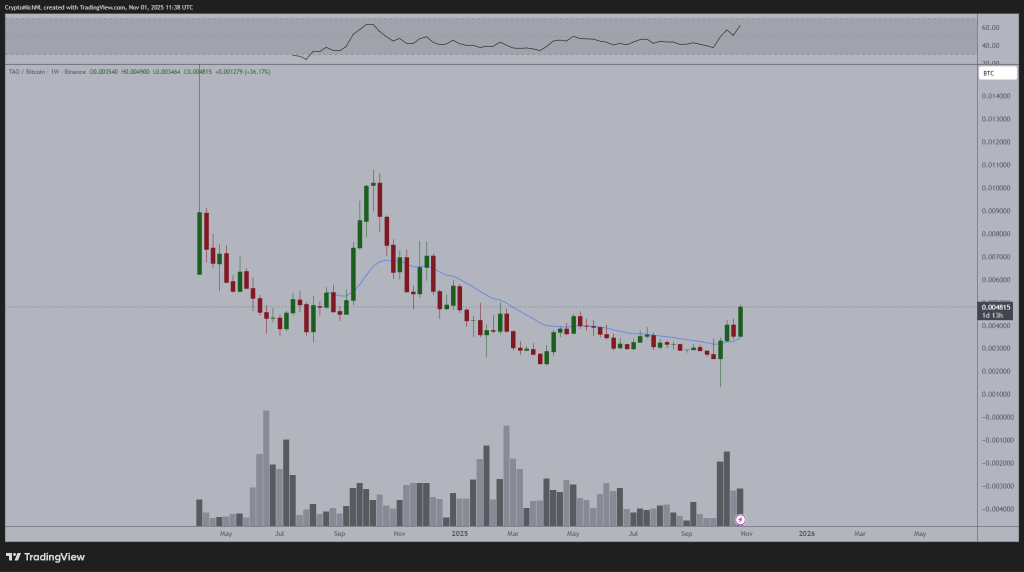 据TradingView数据,TAO/BTC本周飙升36.17%至0.004815 BTC,创近一年新高。Michaël van de Poppe指出,此次突破历经数月盘整,现站稳短期均线上方确认升势。