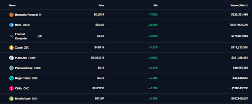 今日加密货币涨幅榜:Humanity Protocol 拔得头筹