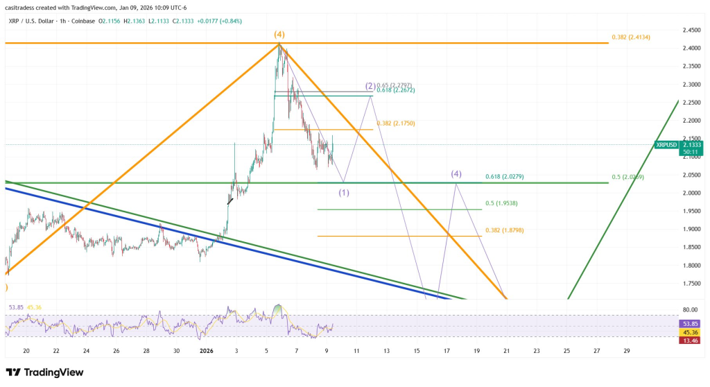 2.03美元区域是目前需要关注的关键水平。该区域与重要的0.5斐波那契回撤位重合,并在近期结构中起到支撑作用。CasiTrades预计瑞波币将在此位置做出反应,可能产生向约2.26美元附近局部0.618回撤位的短期反弹。