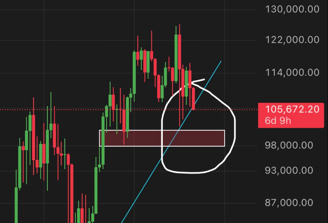 "若您仍持看涨立场,当前价位至关重要。若失守98,000美元支撑位,我们将失去约1.5年的上涨动能,很可能进入熊市。所有人的目光都聚焦在98,000美元关口!这是周线图,能让我们清晰观察支撑位。"