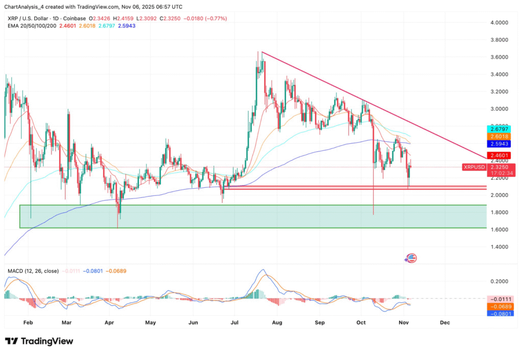 XRP近期显著下跌,突破了2.4至2.5美元的关键支撑区间。该价位在9月至10月期间曾是稳固的底部,但当前卖方力量占据主导,导致XRP在2.1至2.25美元区间挣扎。买方介入虽减缓了跌势,但若无法守住该区间,下一个重要需求位将下移至1.8至1.9美元。