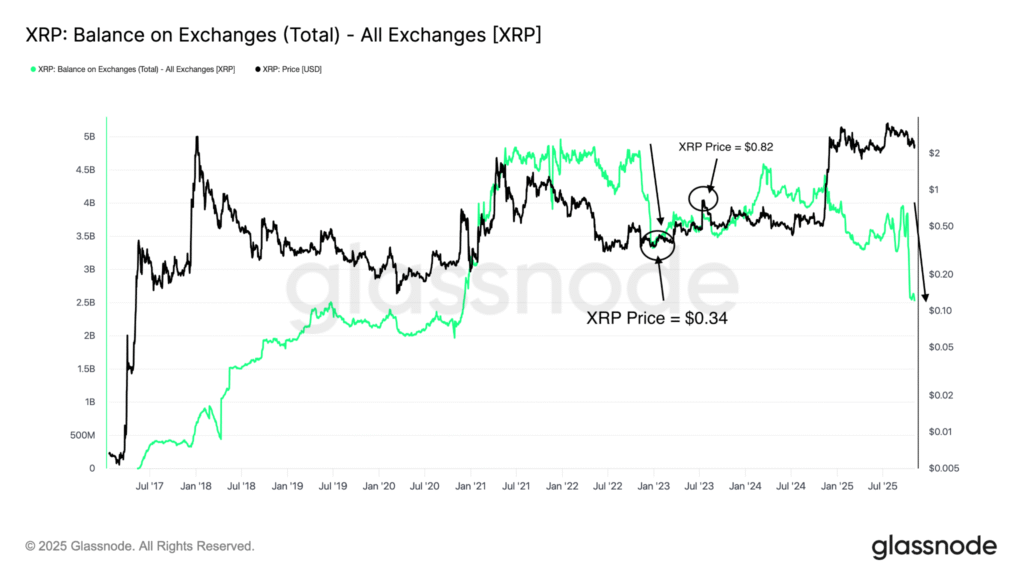 链上数据显示,自9月以来交易所已流出近14.3亿枚XRP,该模式与2022年末的积累阶段高度相似,而当时随后出现了大幅上涨。提现行为表明投资者正将代币转移至长期存储,而非保留在交易平台,这被视为潜在的看涨信号。