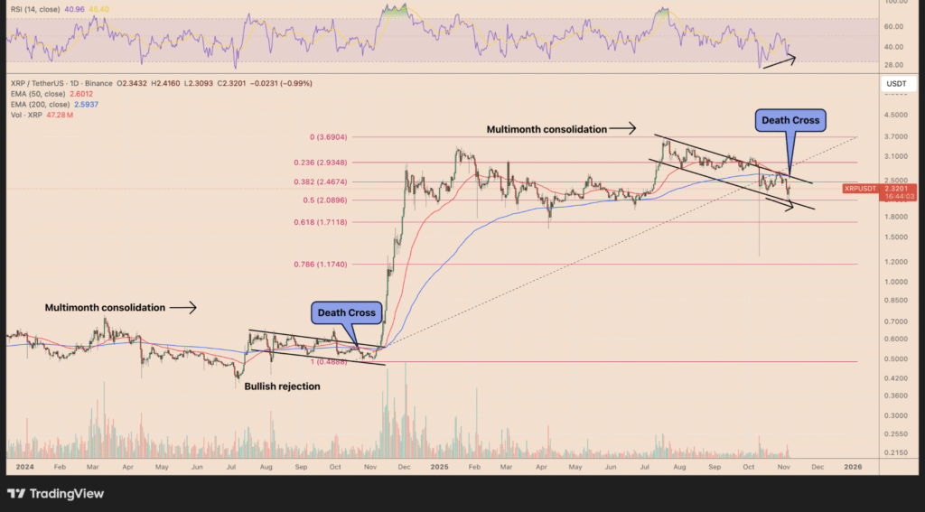 当前XRP的技术形态与2024年末引爆大涨前的结构如出一辙。当时在50日与200日均线形成死亡交叉后,XRP突破下降通道,短时间内从0.48美元飙升至3.69美元。