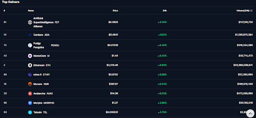 FET联盟以9.35%涨幅领跑,ADA、PENGU和M代币涨幅超8%