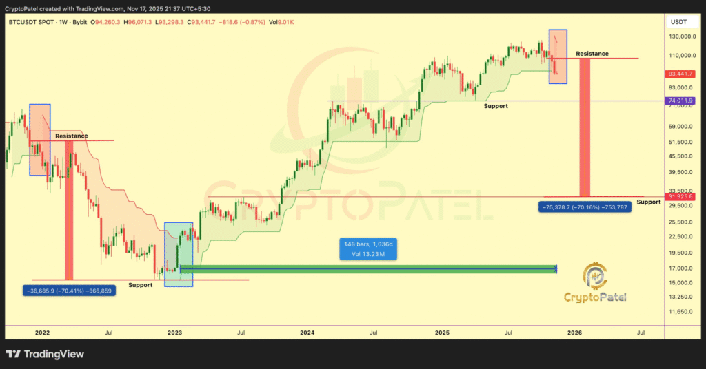 据Patel分析,该模式在比特币历史上往往预示大幅下跌,他警告称可能面临高达70%的潜在跌幅,这与2022年初的技术形态相似。