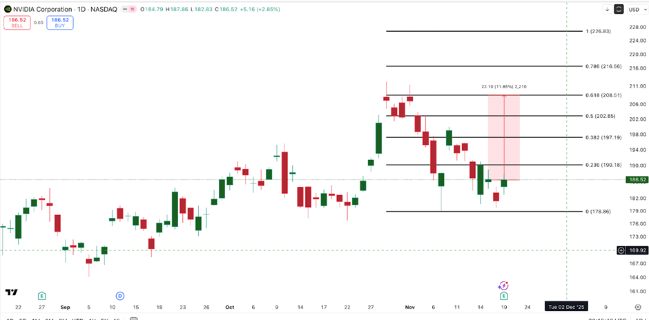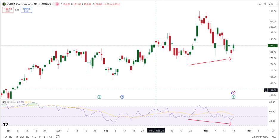 10月22日至11月18日期间,NVDA股价形成更高的低点,而相对强弱指数(RSI)却出现更低低点——这种背离通常暗示卖压减弱。