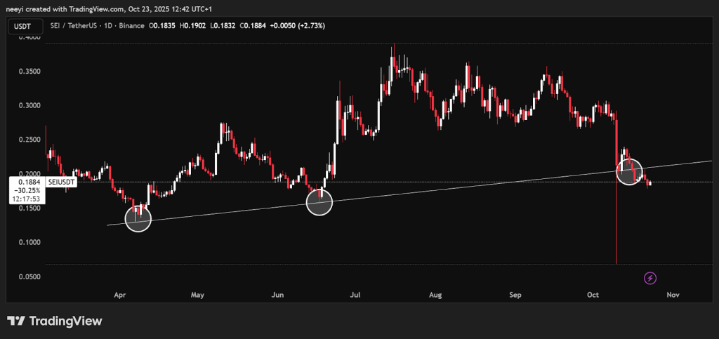 日线图呈现更复杂的局面。四月以来,SEI始终沿关键上升支撑线稳步攀升,期间多次成功反弹。每次回升都帮助该代币维持了整体上涨趋势。