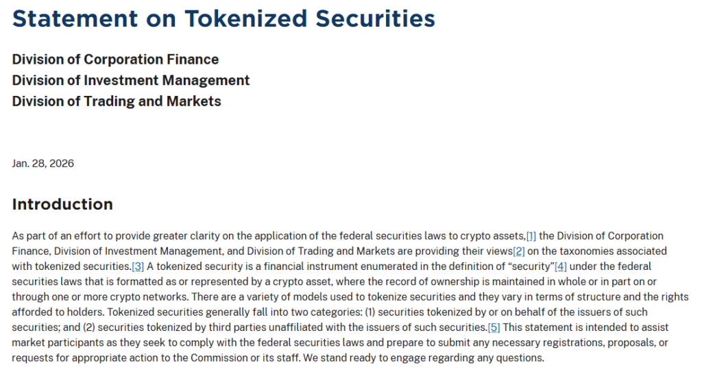 代币化证券常被描述为在区块链上交易现实世界资产的一种更清晰、更快速的方式。但美国证券交易委员会的新指引将讨论带回了基本原则。