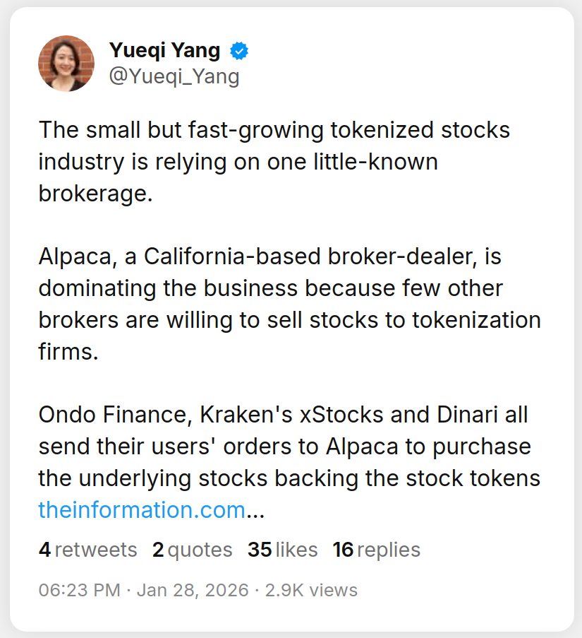 Alpaca的核心作用凸显了集中风险,揭示了链上股票交易在多大程度上仍依赖于单一的链下经纪商。