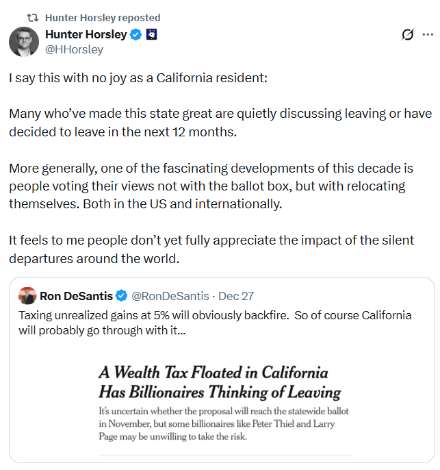 链上数据平台Dune联合创始人弗雷德里克·哈加指出,挪威曾实施类似税收政策,导致富裕阶层大规模外流,最终税收收入低于预期。他强调:“向加州提醒:对未实现资本收益征税已导致挪威前400名纳税人过半财富转移至海外。