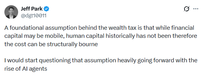 城堡岛风投创始合伙人尼克·卡特与ProCap BTC首席投资官杰夫·帕克则推测,该税收将促使亿万富翁转移全部资本。卡特周日表示:“虽然我欣赏罗·康纳,也曾与他的优秀团队成员交流,但不禁质疑——他们是否对财富税引发的资本流动性进行过分析?”他补充道:“资本流动性已达历史新高,一次性财富税向资本释放的信号如同主权违约,预示着未来可能出台更多征税措施。”