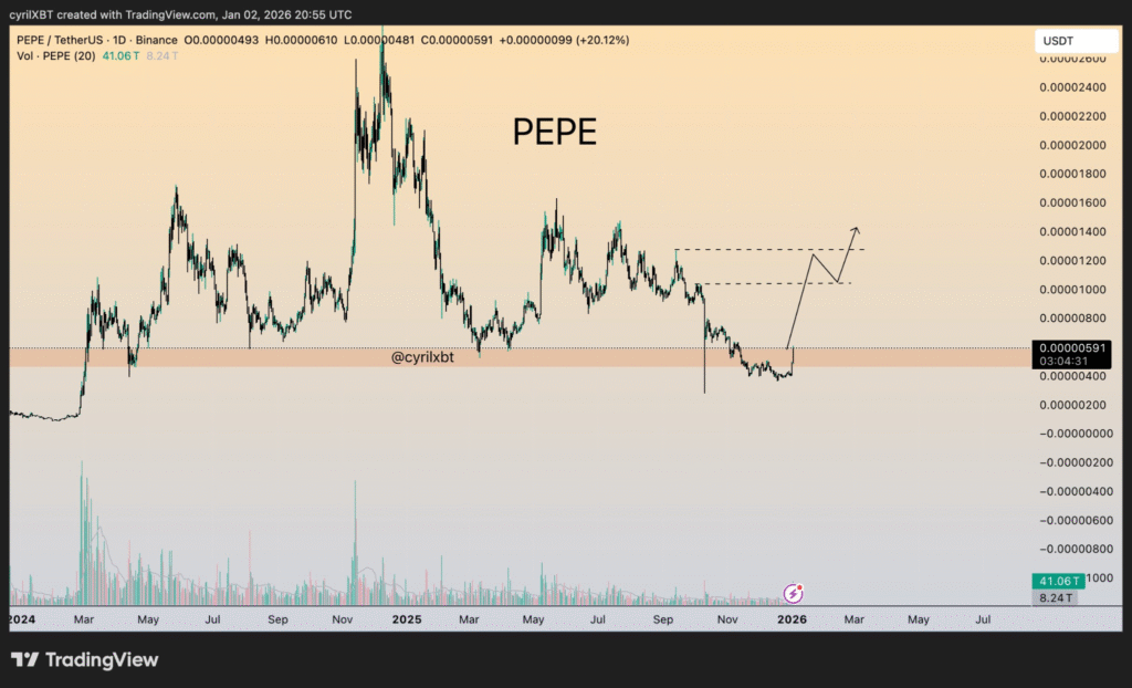 经历数月盘整后,PEPE已突破前期阻力位,这标志着价格走势迎来关键转折点。当前交易于0.00000598美元附近,正试图在长期下跌趋势后实现反弹。
