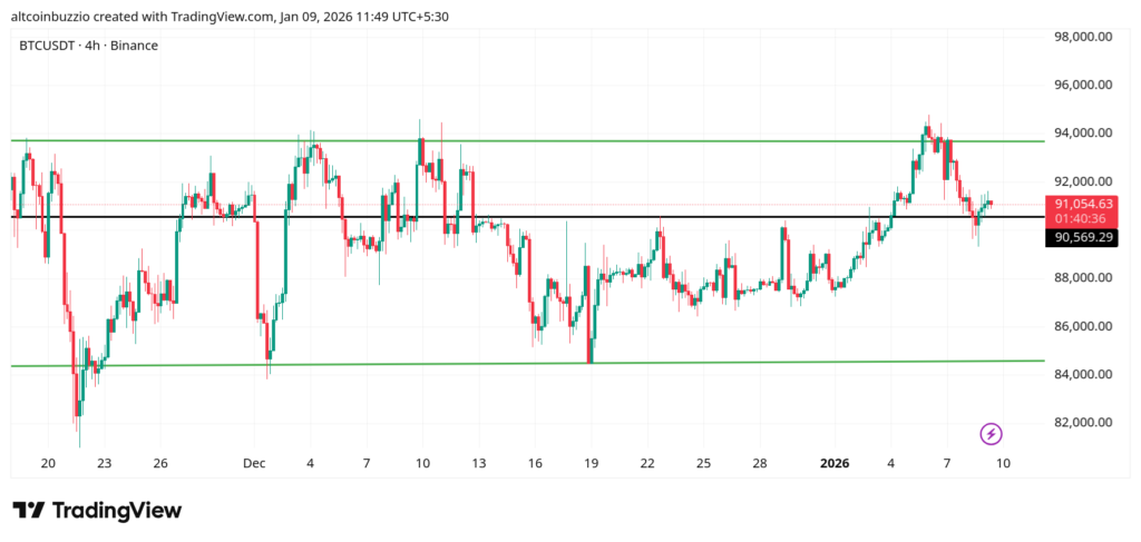 交易者需密切关注90569.3美元与91429.5美元附近的反应,这些水平定义了当前的平衡区域。