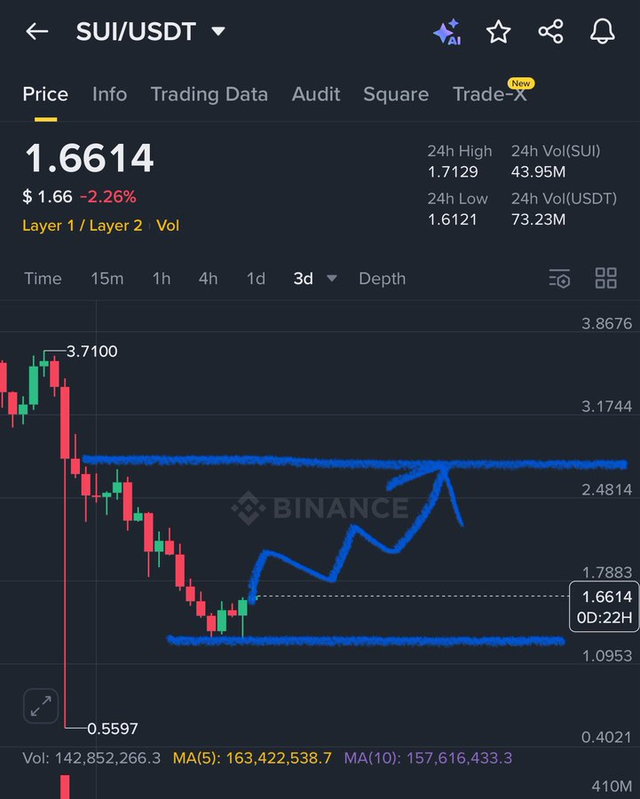 Crypto GVR (@GVRCALLS) 分享的图表显示,若SUI维持积累阶段,上行目标可能位于2.5至3美元区间。经历持续下跌后,该代币现交易于1.61美元附近。该预测勾勒出价格将逐步突破多层阻力位的路径。
