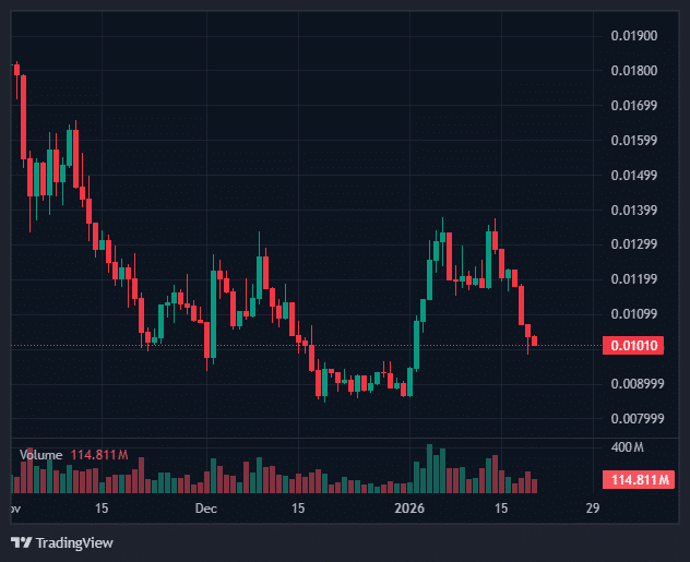 随着热情消退,交易者开始锁定利润。卖压上升推动代币跌破0.011美元,触发了一系列止损单。图表上的大量抛售成交量暗示着获利了结而非恐慌性抛售,标志着模因币市场常见的“利好出尽”阶段。随着市场整体情绪转向避险,短期杠杆仓位面临压力。