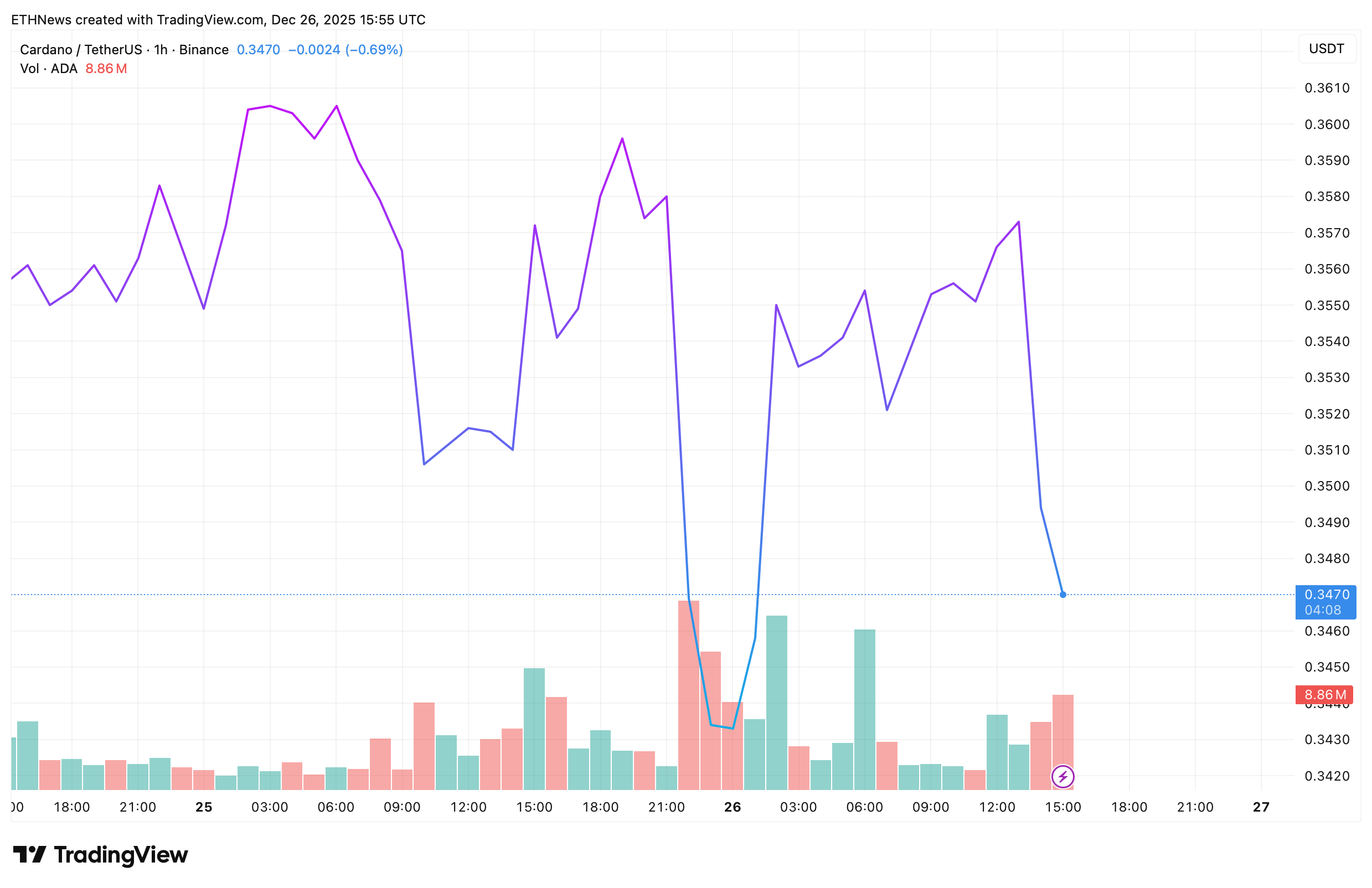 在ADA/USDT一小时图表中,卡尔达诺现报0.347美元附近。此前突发抛售曾将价格短暂打压至0.345美元下方,但跌势迅猛而短暂,多头迅速入场推动反弹。