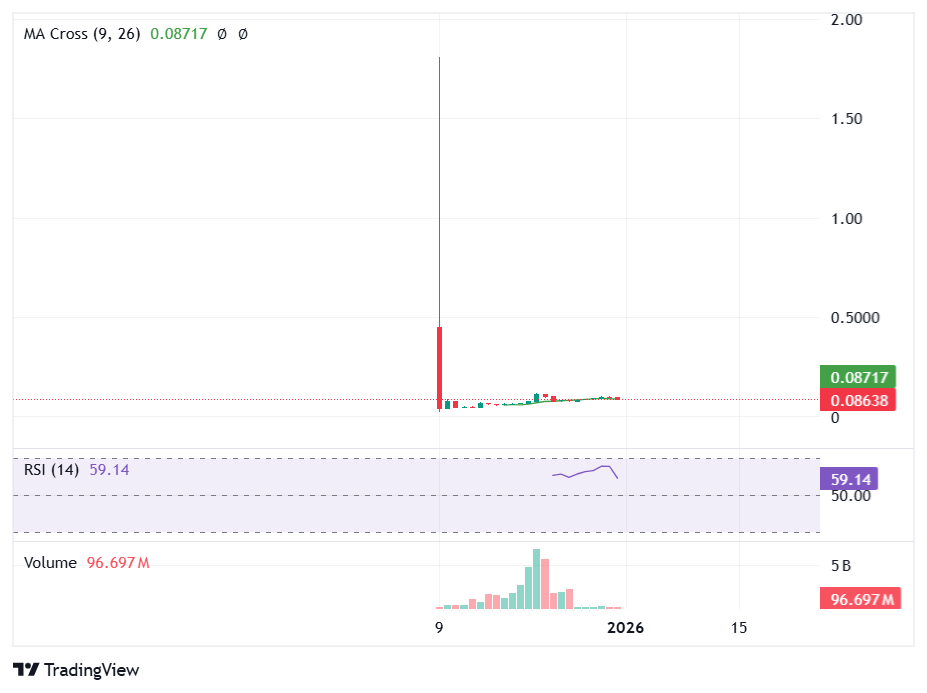 CoinMarketCap数据显示,午夜币的相对强弱指数(RSI)已达到67,表明市场处于超买状态。交易者将周内超18%的涨幅视为获利了结良机,特别是在目睹价格在0.09美元关口遭遇阻力后。