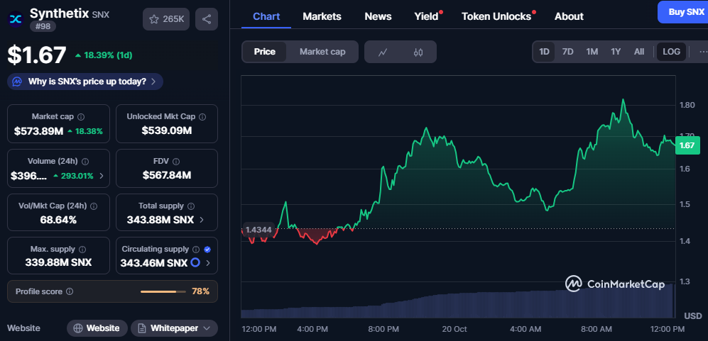 SNX在过去24小时内呈现单边上涨态势,开盘报1.43美元后持续攀升,日内最高触及1.80美元。这一稳健上升趋势标志着SNX在DeFi市场的强势回归。