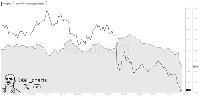 分析师Ali(@ali_charts)分享的图表显示,持有10万至100万ADA的地址持仓量急剧下降。过去一周这些大户抛售超400万ADA,引发市场短期疲软。