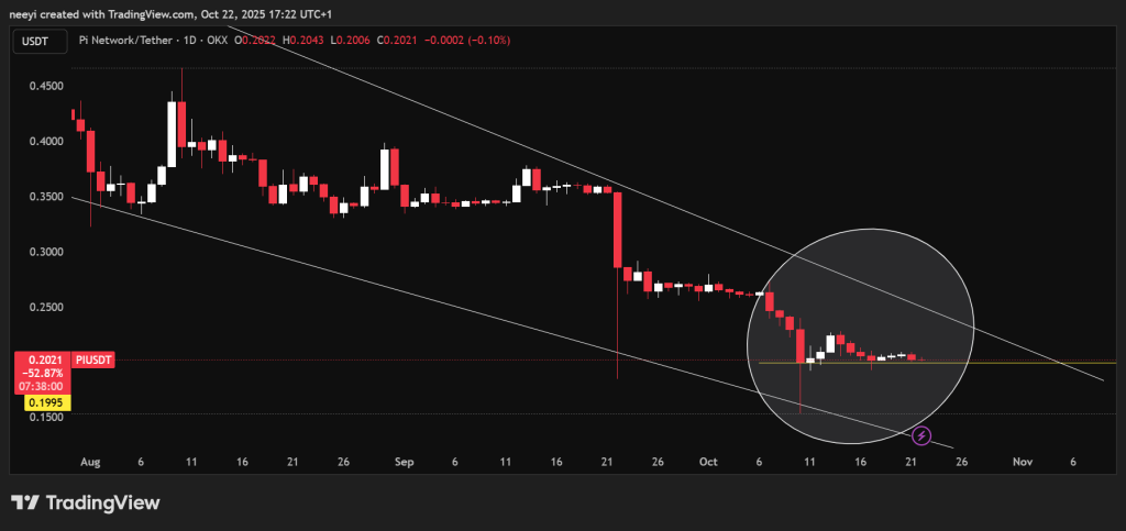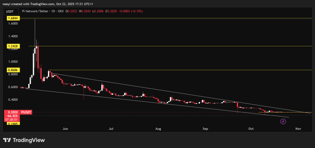 从小时图来看,PI币展现出一定的抗跌性。尽管近期价格下跌约1%,但买家在0.2美元区域迅速进场承接。该价位已成为关键支撑区域——10月21日同一支撑位曾触发5%的日内反弹,表明多头正在此区间PI价格图表