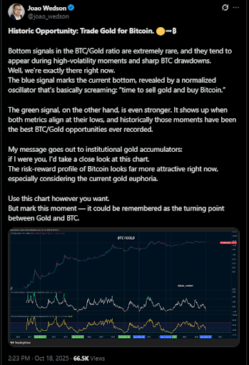 根据其图表分析,两个颜色标记凸显了信号区域:蓝色标签代表当前震荡指标底部,绿色标签则显示指标间更深层次的协同。Wedson表示,用于标准化两种资产价格偏离度的震荡指标正在发出转向信号,他将其归纳为"卖出黄金,买入比特币"的时机。