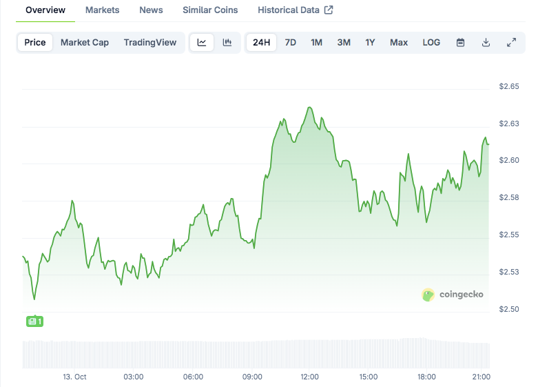 若能在三日图上实现完整突破并收于该价位上方,XRP或将重拾升势挑战2.85美元(21日均线位置)。据CoinGecko数据显示,XRP当前报价2.62美元,24小时交易量超90亿美元。