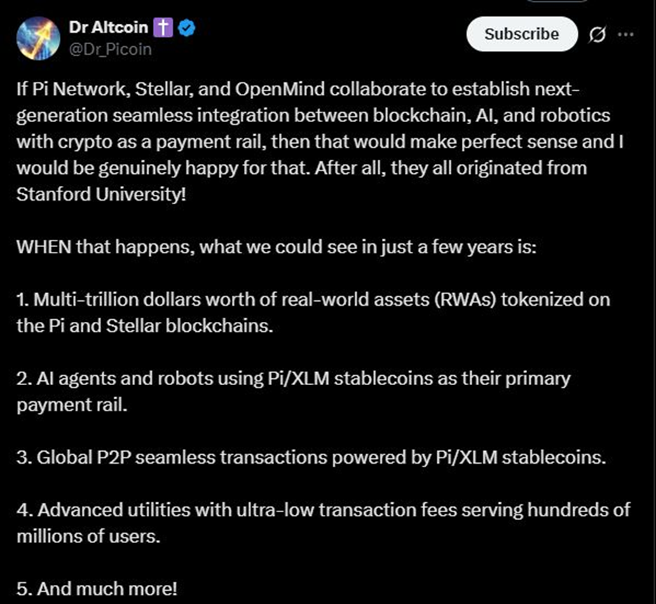 Pi Network正在积极顺应当前牛市的核心叙事,但关于核心团队的具体实施路径,外界仍知之甚少。作为Pi Network和Pi币最重要的支持者之一,Dr. Altcoin再次就如何在这些关键领域取得突破发表见解。这位分析师提出,Pi Network、OpenMind与Stellar网络之间应建立三方合作。