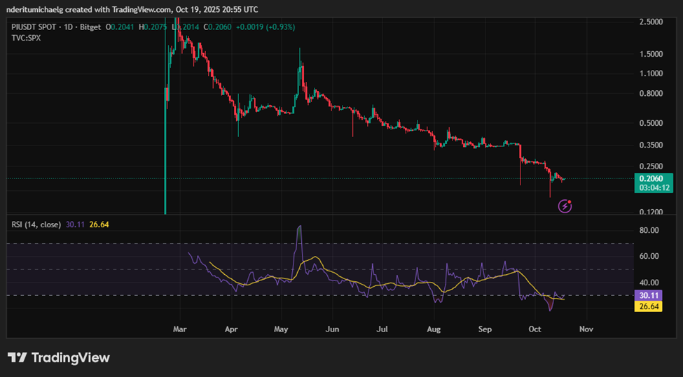 2025年以来Pi币整体呈现颓势,虽多次显现筑底迹象,但空头始终占据上风。在10月10日加密货币市场集体暴跌期间,Pi币曾严重超卖,价格跌至0.15美元低点,不过目前已回升至0.20美元上方。