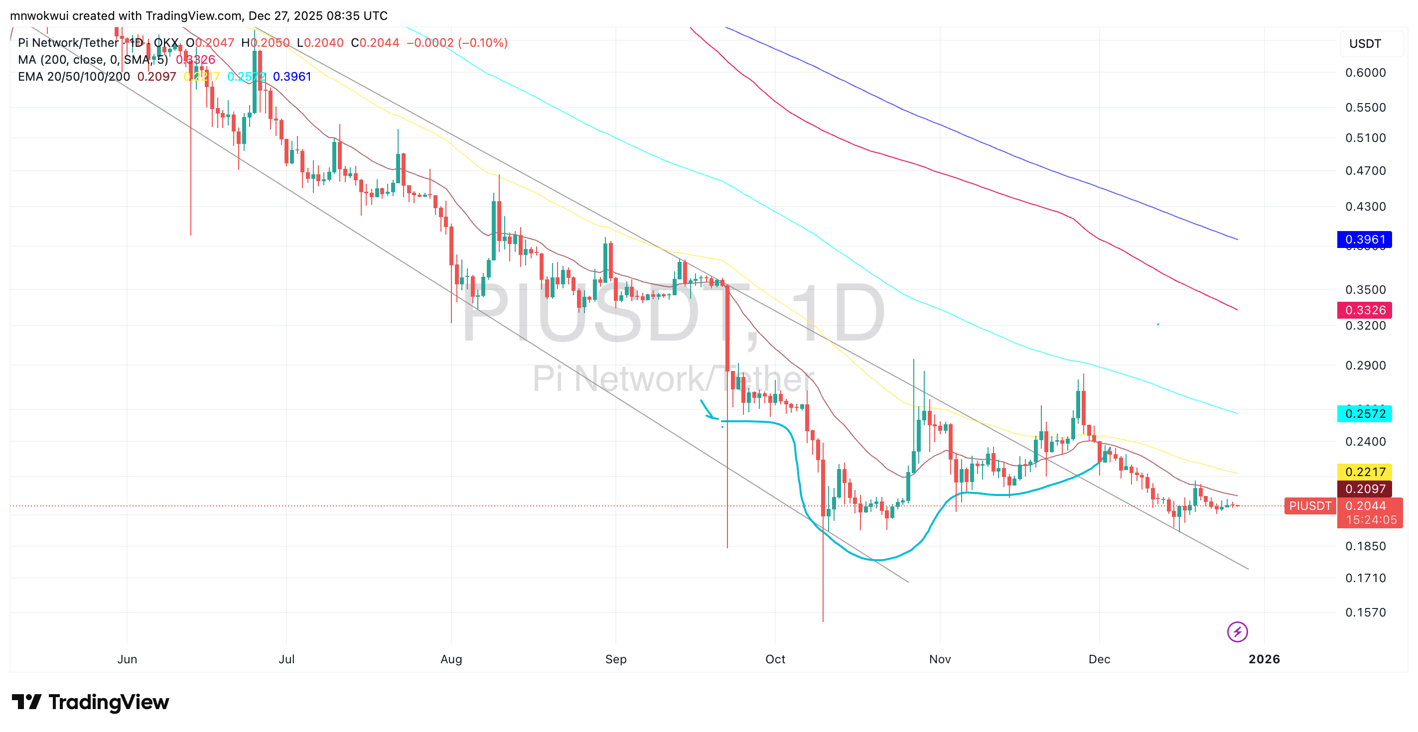 从PI/USDT日线图观察,十二月初以来的价格走势清晰表明市场仍处于调整阶段。PI进入本月时交易于短期下降通道上轨附近,但迅速丧失上行动能。卖盘在0.25-0.26美元区域介入,引发持续近整个月的稳步回调。截至最新交易时段,PI徘徊于0.20-0.21美元区间,难以形成任何方向的持续性走势。