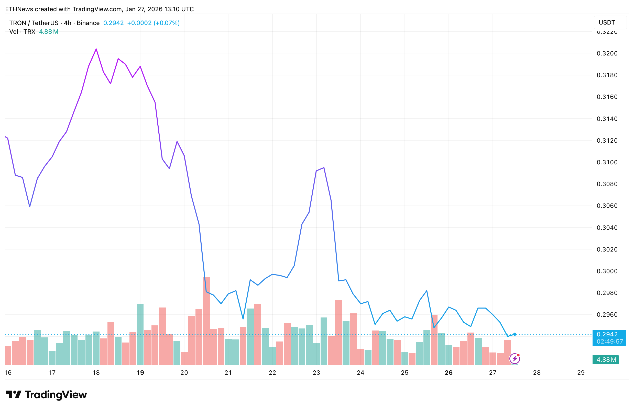 4小时图表显示,TRX本月初从0.318–0.320美元的局部高点回落,随后急剧回调至0.29–0.295美元支撑区域。该区域现已形成短期需求基础,过去数个交易日内价格多次守稳0.29美元关口。