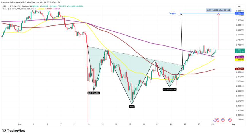 XRP价格在三小时图上同时形成头肩底形态,这个看涨信号暗示价格可能攀升至3美元甚至更高。该形态通常会在突破颈线后完成,当前情况下可能触发抛物线式上涨,量度目标可达3.02美元——较现价高出约14%。