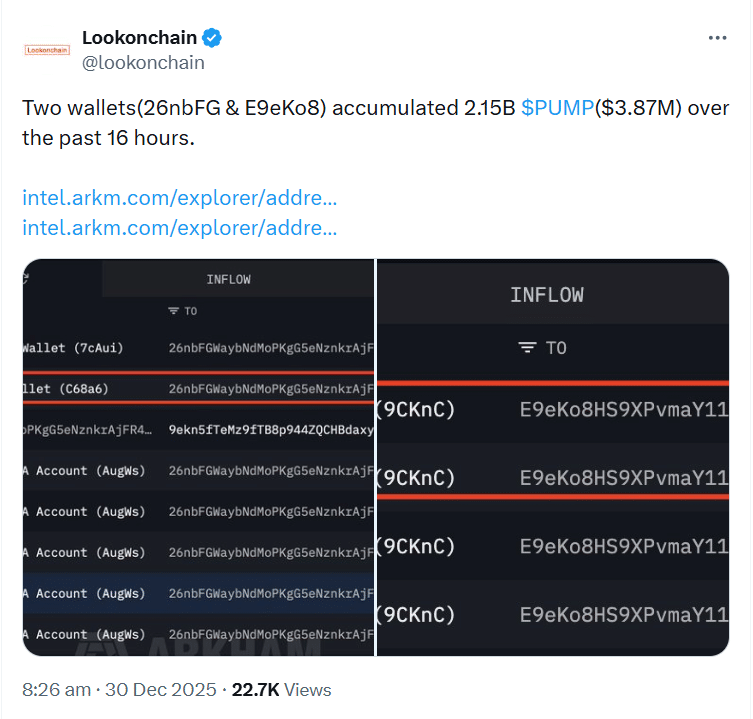PUMP巨鲸吸筹迅速成为社交媒体焦点。Lookonchain在X平台披露26nbFG与E9eKo8两个地址在16小时内扫货21.5亿枚PUMP(价值387万美元)后,立即引发舆论涟漪。