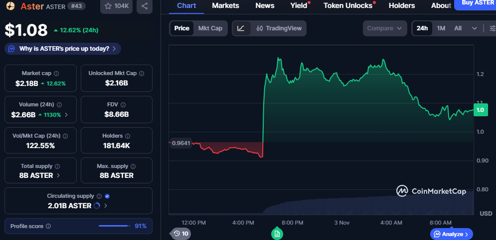 11月2日,CZ一次性清仓价值约3700万美元的3500万枚ASTER,此举逆转了先前看涨立场。由于没有持仓限制,大户地址迅速抛售导致价格从1.30美元高点快速回落。尽管当前1.08美元的价位可能预示高成交量环境下的短期盘整,但分析师警告称流动性事件仍是关键变数。