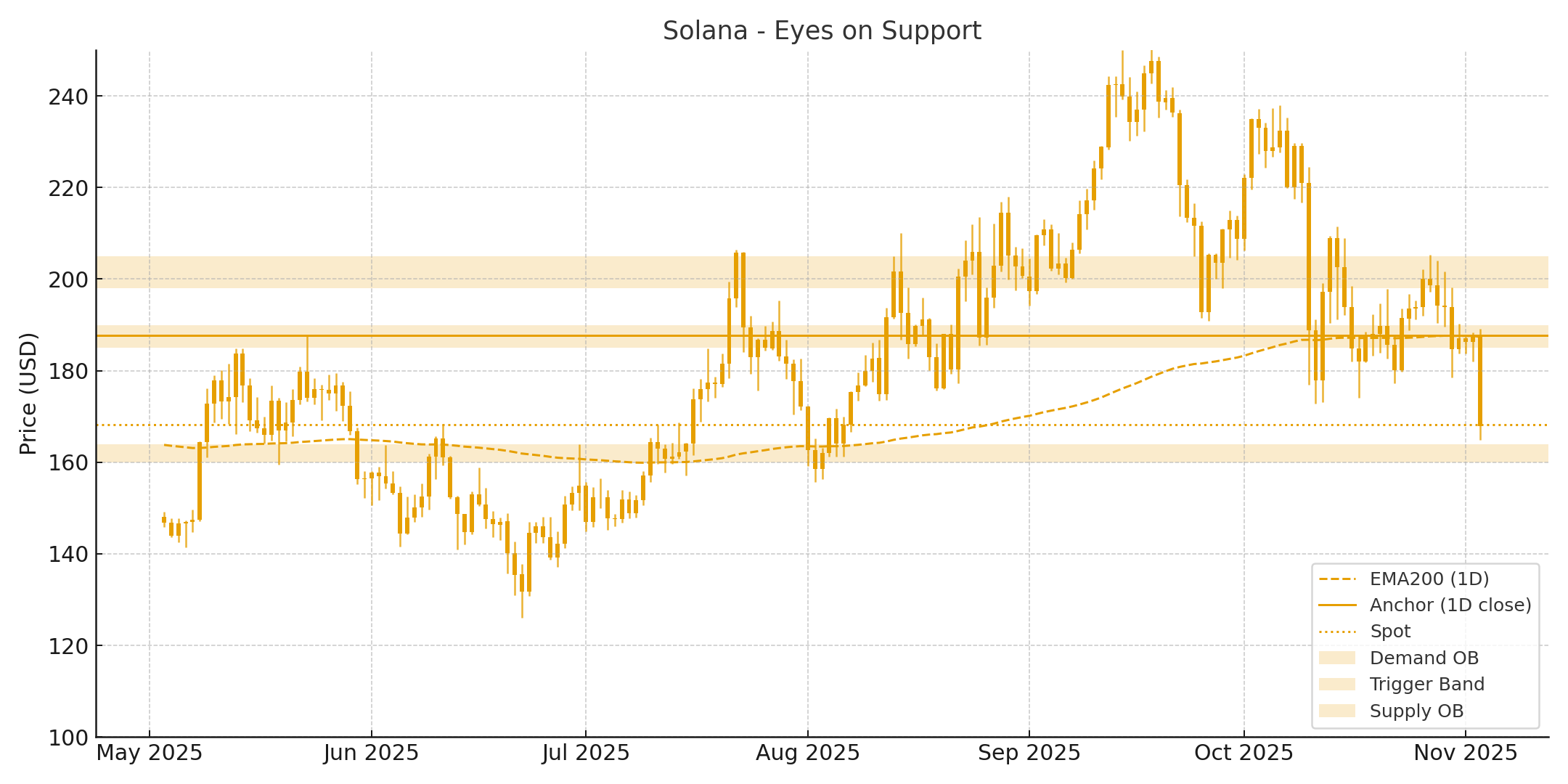 短线交易者宜保持耐心并采取反应型策略。需满足以下条件方可考虑进场:价格站稳185–190美元上方(中性转折),或从160–164美元区域获得动量确认的有效反弹。若日线收盘突破上述区域,可能开启向198–205美元的动能;反之若失守支撑位,或将下探150美元关口。整体市场情绪维持谨慎,与主流加密货币避险基调一致。