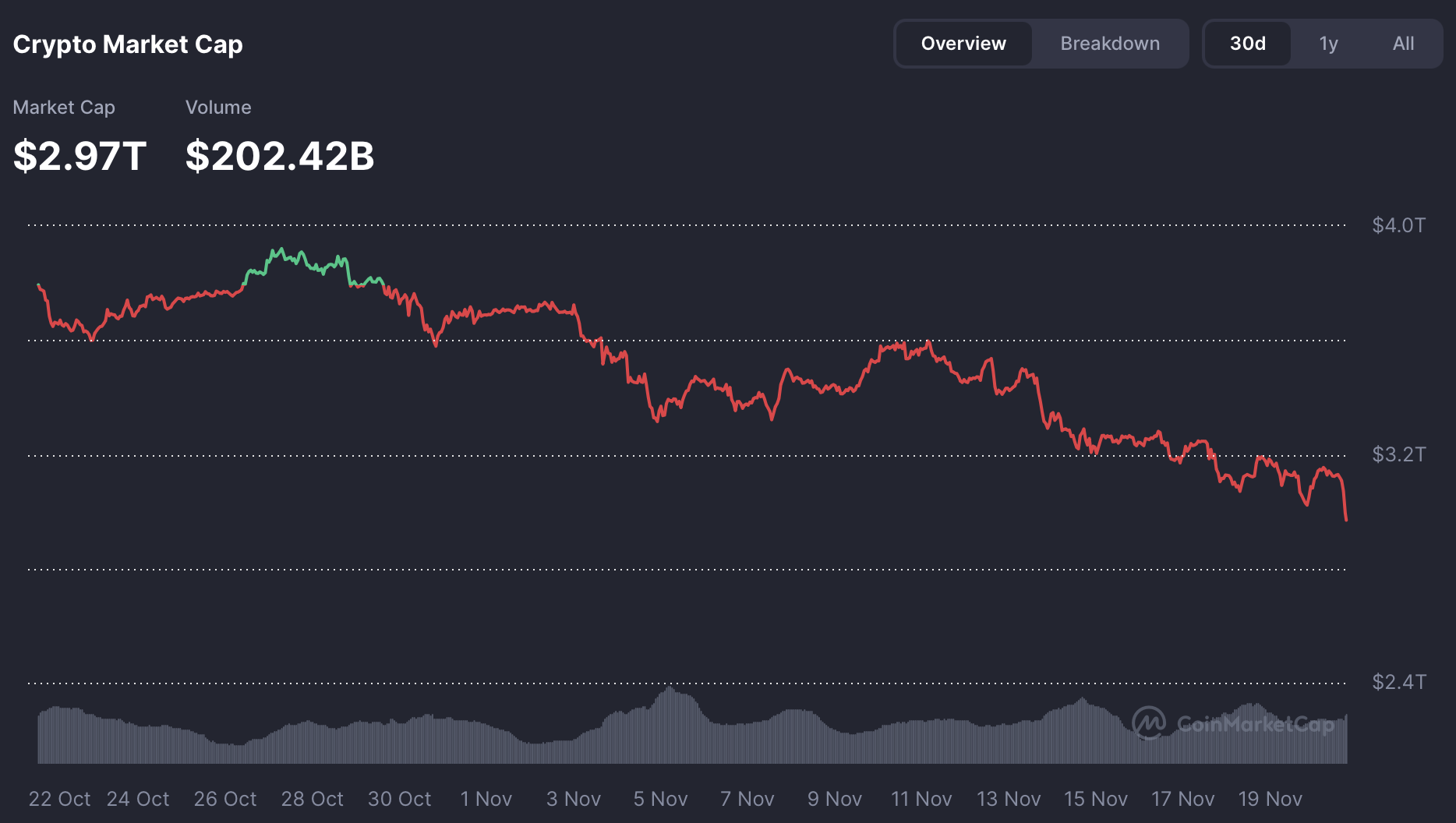 全球加密货币总市值已滑落至2.97万亿美元,延续数周跌势,反映出当前股票和债券市场的普遍谨慎情绪。美国最新就业数据动摇了投资者对美联储12月政策会议的预期,引发的不确定性浪潮正严重压制数字资产表现。