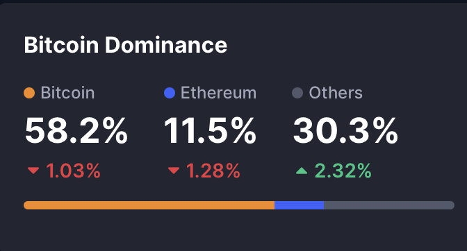 这种数据真空令市场不安。随着美联储可能被迫长期维持高利率,风险资产迅速作出反应:比特币市值占比降至58.2%,以太坊跌至11.5%,表明资金外流并非局部现象;山寨币指数下滑至24/100,显示中型市值代币相对表现疲软;而加密货币恐惧与贪婪指数骤降至15,反映散户投资者恐慌情绪加剧。
