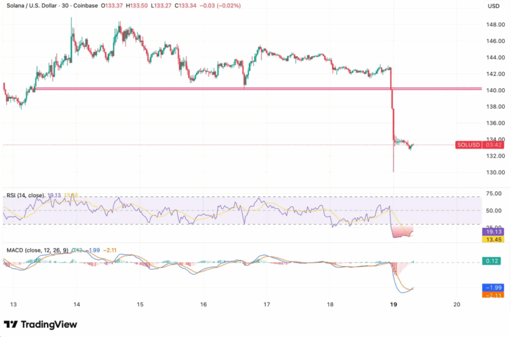 Solana(SOL)在经历大幅下跌后,目前交易价格约为133.42美元,已跌破包括20日指数移动平均线(137.42美元)和50日指数移动平均线(137.94美元)在内的多个关键支撑位。这轮大幅下跌由一系列多头清算推动,导致杠杆交易者被迫平仓。急剧抛售使市场变得脆弱,目前尚未出现买方支撑的迹象。