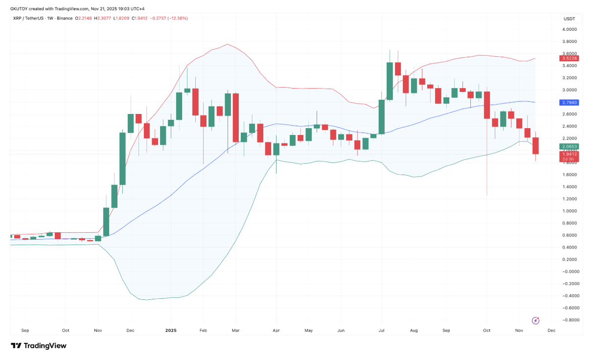 近期交易时段对XRP而言动荡不安,由于价格跌破2美元关口,市场对其暴跌的担忧日益加剧。许多投资者将此视为行情急剧下行的预兆。然而通过周线图的深度分析,我们却能发现不同的叙事逻辑。TradingView在更广时间维度构建的布林带指标并未印证市场恐慌,反而揭示出XRP的价格走势正与历史反转形态逐步契合。