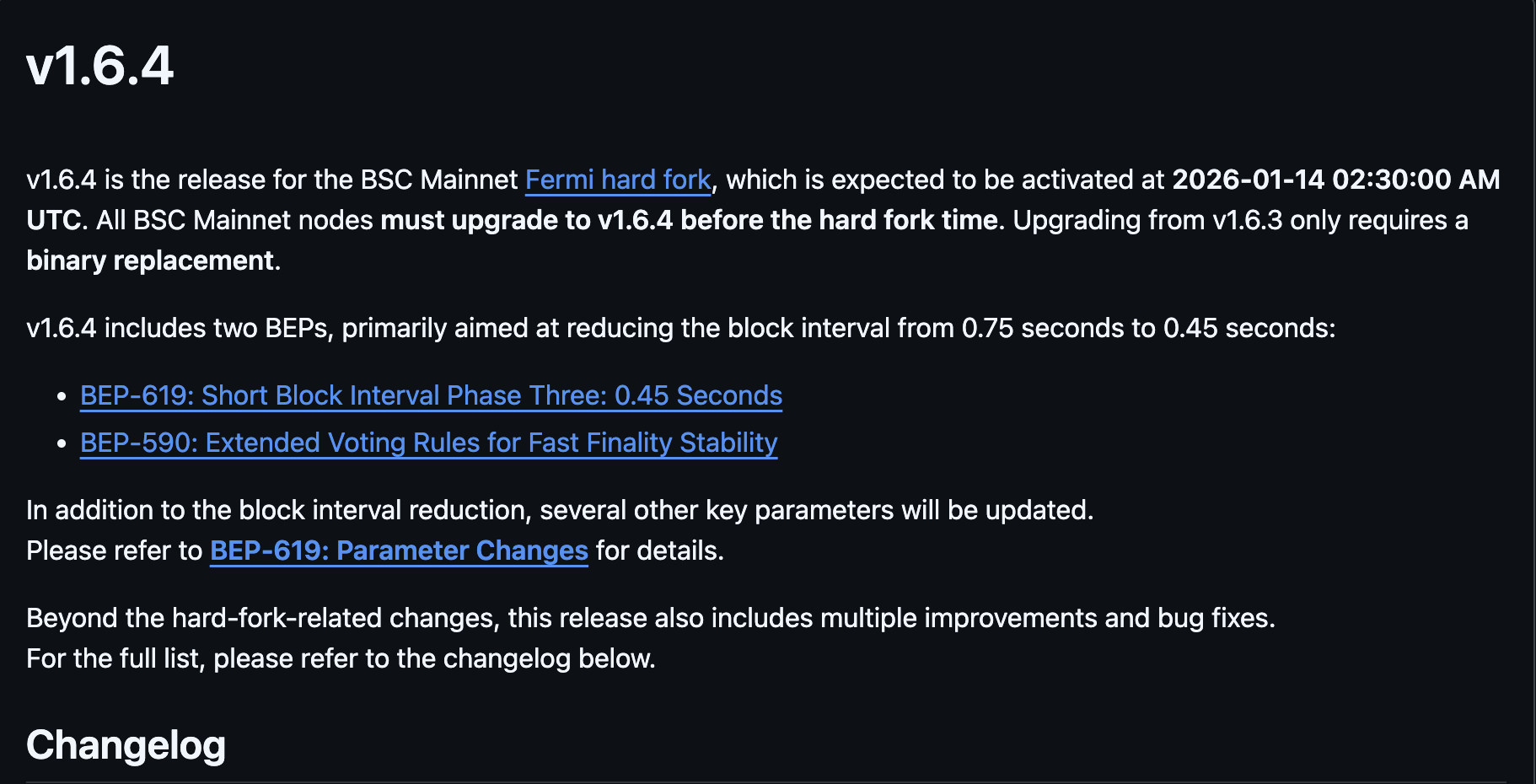 BNB智能链的费米硬分叉在测试网阶段运行约两个月后,已计划于1月14日在主网激活。根据BNB社区的GitHub页面信息,费米升级将把区块间隔从750毫秒缩短至250毫秒,以支持需要亚秒级出块速度的"时间敏感型"应用。