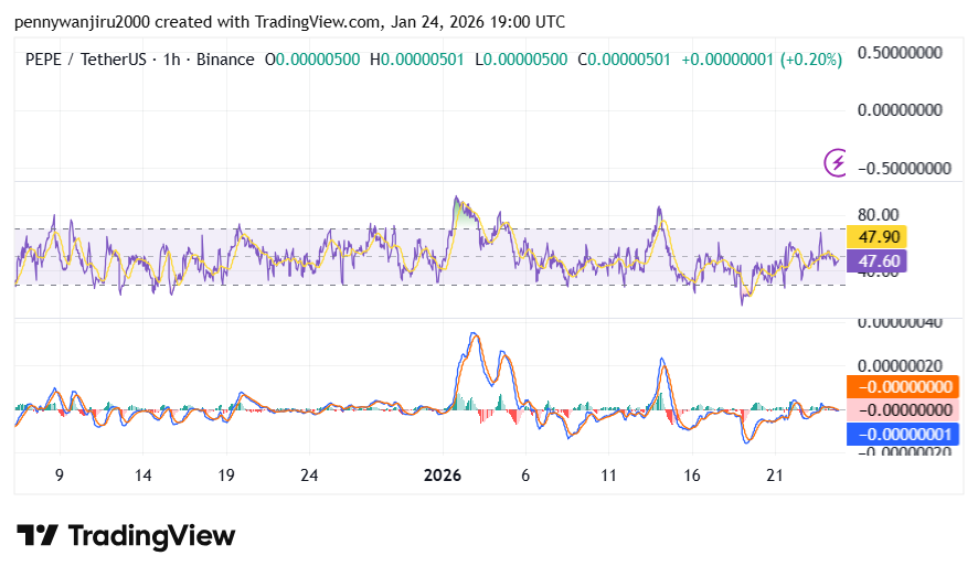 尽管日跌幅达3.5%,PEPE仍坚守0.054957美元支撑位上方。RSI接近49且MACD走平,确认动能呈中性态势。其对比特币和以太币的上涨表现与美元计价价格的疲软形成反差。