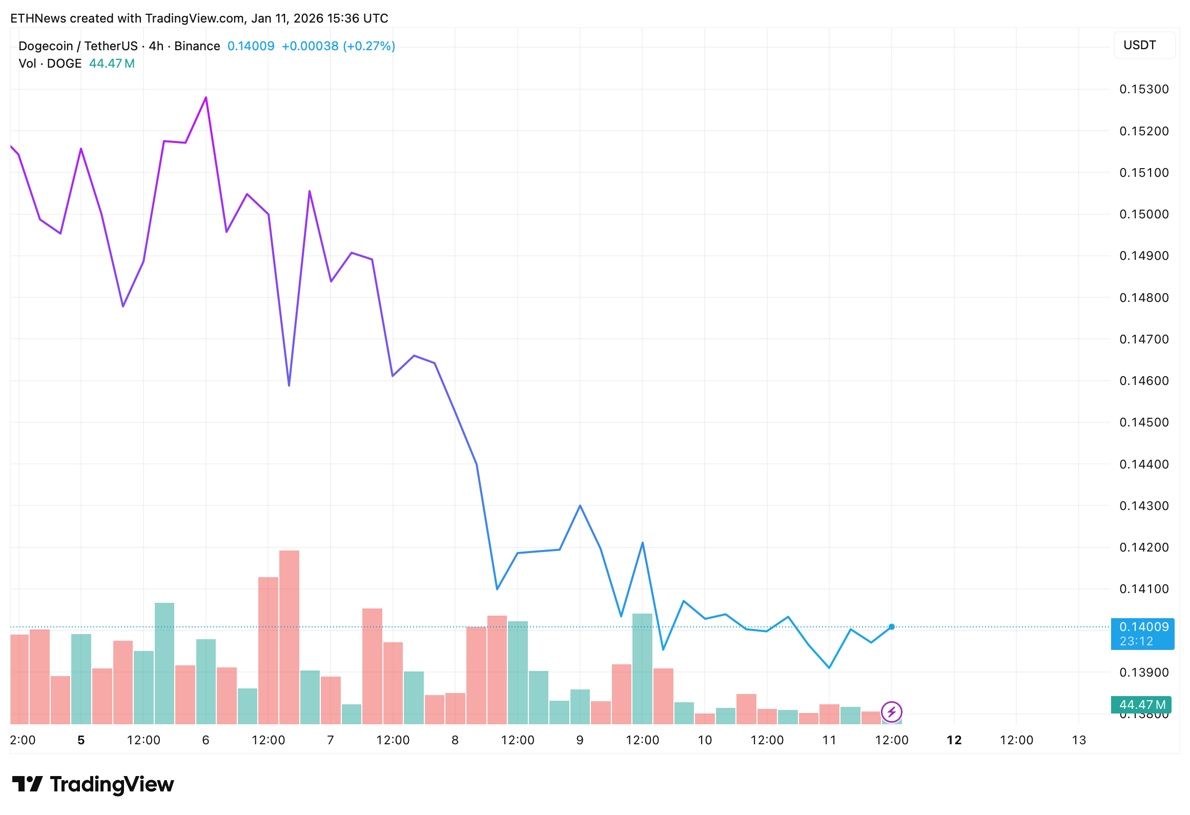 TradingView图表显示,狗狗币在4小时周期交易于0.1400美元附近。近期K线表明价格在趋势线突破后趋于稳定,并未出现强势延续走势。成交量呈现温和状态,突破时未见明显放量,暗示当前波动主要由技术仓位调整驱动,而非强劲资金流入。