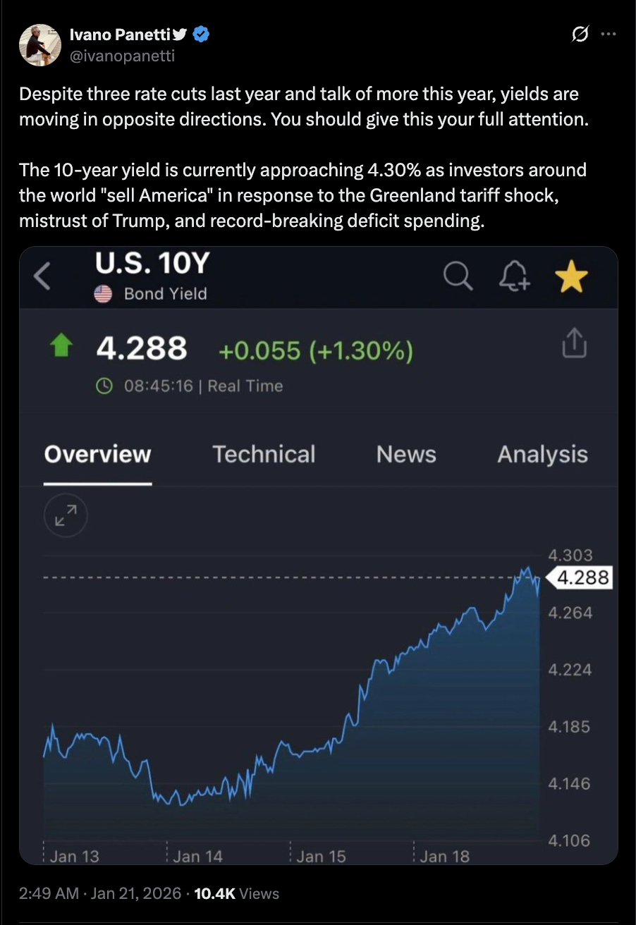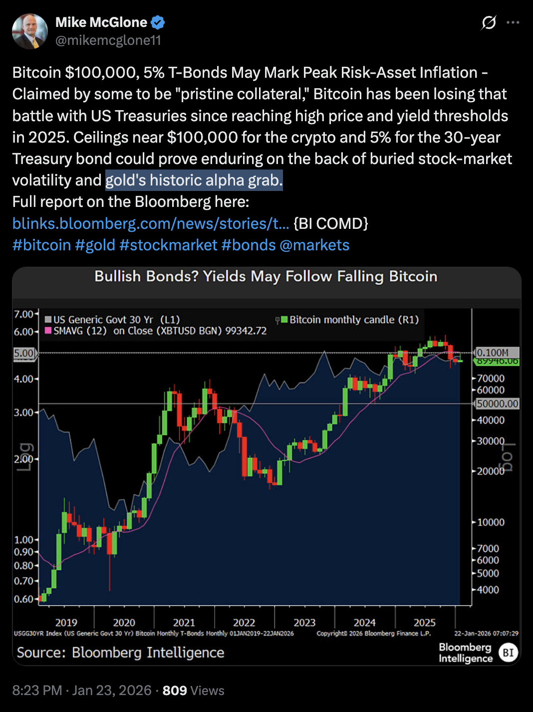 McGlone在1月23日的分析中强调,在长期国债收益率上升同时争夺资金流之际,黄金的“历史性阿尔法收益”正将资本引向这一传统的通胀对冲工具。