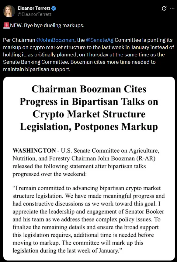 加密市场反应平淡,因《清晰法案》延期被视为争取共识的额外时间,而非法案失败的信号。此次延期由负责监管加密交易规则的参议院农业委员会提出,旨在投票前争取更广泛支持。交易者将此次暂停视为立法进程的暂时放缓而非威胁,主要加密货币价格因此保持稳定。