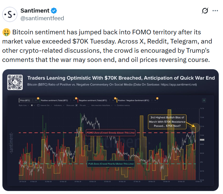 周二,比特币价格回升至7万美元以上,社交媒体上对比特币的情绪已重新转向乐观。这一转变的推动因素之一是唐纳德·特朗普总统近期发表的言论,暗示伊朗战争可能即将结束。