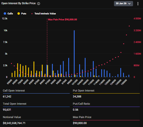本周价值超85.3亿美元的比特币期权即将到期,为2026年最大到期规模;看涨期权头寸密集分布于十万美元附近,而看跌期权在八万五千美元区域占主导;最大痛点位于九万美元附近,期权卖方在此位置获益最大;短期价格走势可能受对冲资金流动及做市商头寸影响。