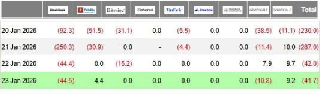 根据表格数据,比特币ETF在1月16日至1月23日的每个交易日均呈现资金净流出。